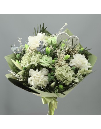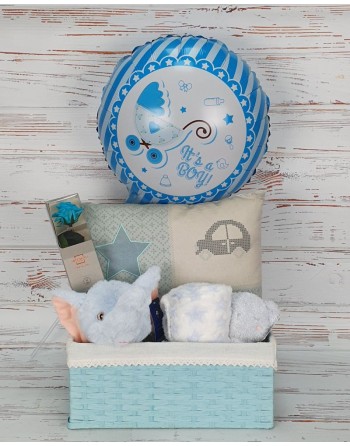 CANASTILLA AZUL CON: 1 ELEFANTE, 1 COJIN, 1 ROSA ETERNA, 1 PELUCHE CON MANTA Y 1 GLOBO.