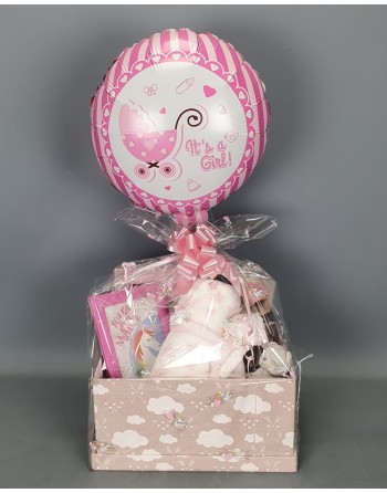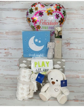 1 JUEGO DE BAEBEROS,1 PELUCHE CON MANTA, 1 ROSA ETERNA, 1 CUADRO,1 SONAJERO,1 PELUCHE, 1 GLOBO Y CAJA.