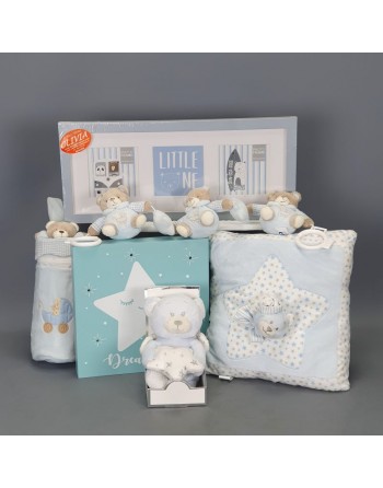 CANASTILLA AZUL CON: 1 PORTAFOTOS, 1 CUADRO LED, 1 COJIN, 1 PELUCHE, 1 PORTABIBERON Y 1 CADENETA DE OSITOS.