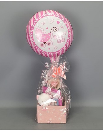 CANASTILLA ROSA CON GLOBO, ROSA ETERNA CHICA, PORTAFOTOS, PELUCHE Y PIN.