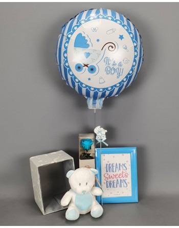 CANASTILLA AZUL CON GLOBO, ROSA ETERNA CHICA, PORTAFOTOS, PELUCHE Y PIN.